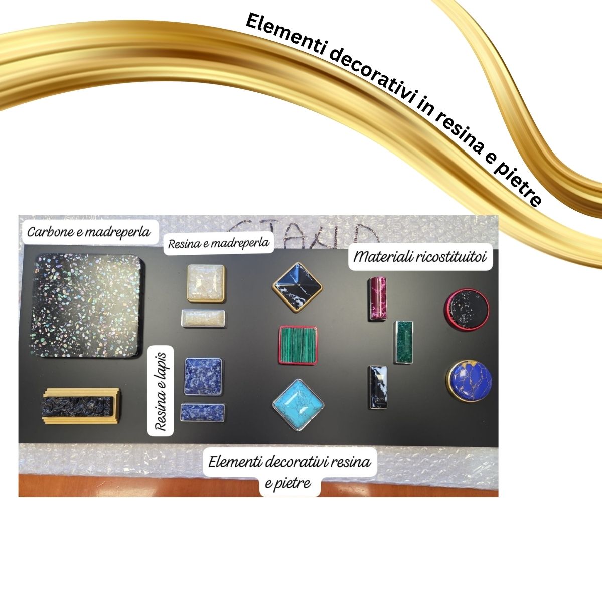 • Soluzioni esclusive e versatili che combinano resina di alta qualità con inserti naturali di madreperla, pietra e altri materiali ricostituiti.